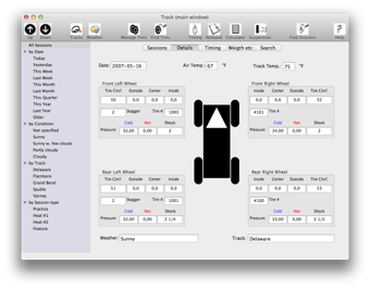 Track makes it very easy to capture your race session data by providing a clearly designed dialog. You see in a glance what informations are captured and you can make some changes later e.g. you can add all the data for a setup and capture the lap timings later or you can capture your lap timings first and add this data to a session later.